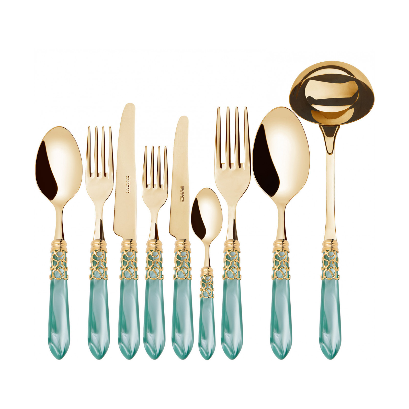 Choose the Melody Gold coloured cutlery set to enchant and captivate your guests at the table. Each piece is crafted with meticulous care and attention in gold PVD-coated 18/10 stainless steel. The elegant acrylic handle and a precious ring with a gold finish recalls the intertwined melodic notes of a memorable musical performance.