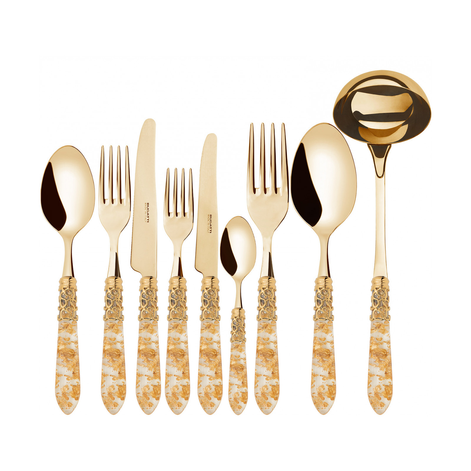 Choose the Melody Gold coloured cutlery set to enchant and captivate your guests at the table. Each piece is crafted with meticulous care and attention in gold PVD-coated 18/10 stainless steel. The elegant acrylic handle and a precious ring with a gold finish recalls the intertwined melodic notes of a memorable musical performance.