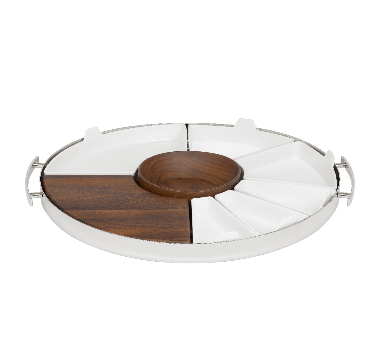 Christofle introduces the MOOD Party tray for life's informal sweet and savory moments. The two-handle stainless steel tray consists of a partial, removable walnut board and bowl. The rest of the tray is composed of six porcelain compartments that double as removable serving dishes. Christofle shakes up the art of entertaining with a new art of sharing concept. MOOD Party by Christofle, with its avant-garde vision of convenience and comfort, invites itself to all tables as a promise of sharing and memories.