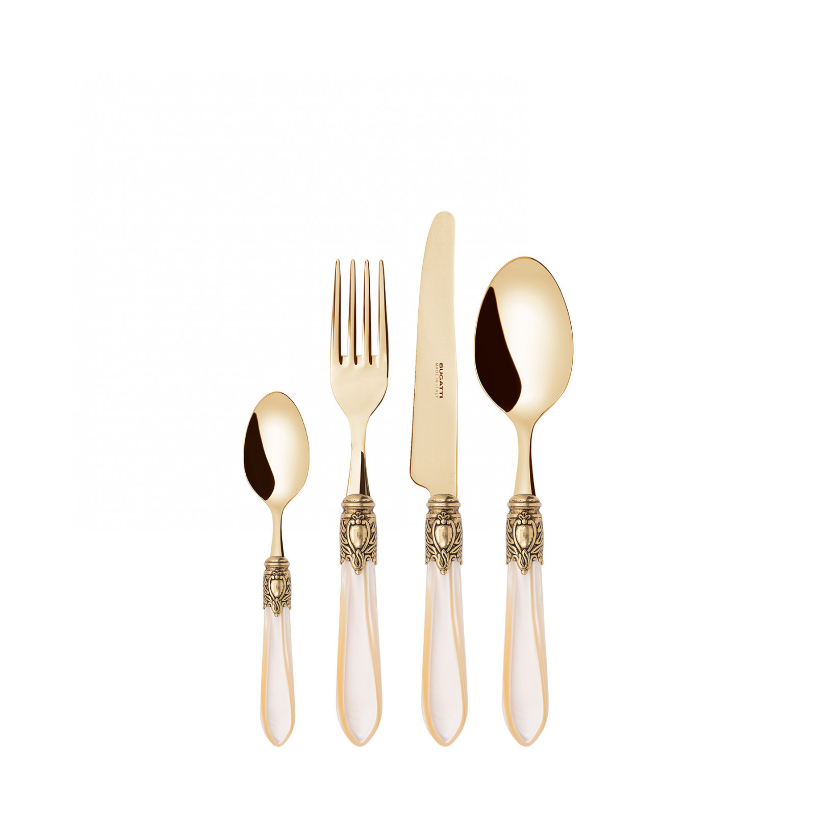 Observe the most important rules of etiquette by bringing Oxford Gold coloured cutlery to the table. To ensure an elegant table with a regal spirit, each piece in the Oxford range is made of gold PVD-coated 18/10 stainless steel, with an acrylic handle embellished with a sophisticated antique gold-finished ring that resembles a noble coat of arms. The Oxford Gold cutlery range is the perfect accessory to ensure an even more elegant and regal table setting.