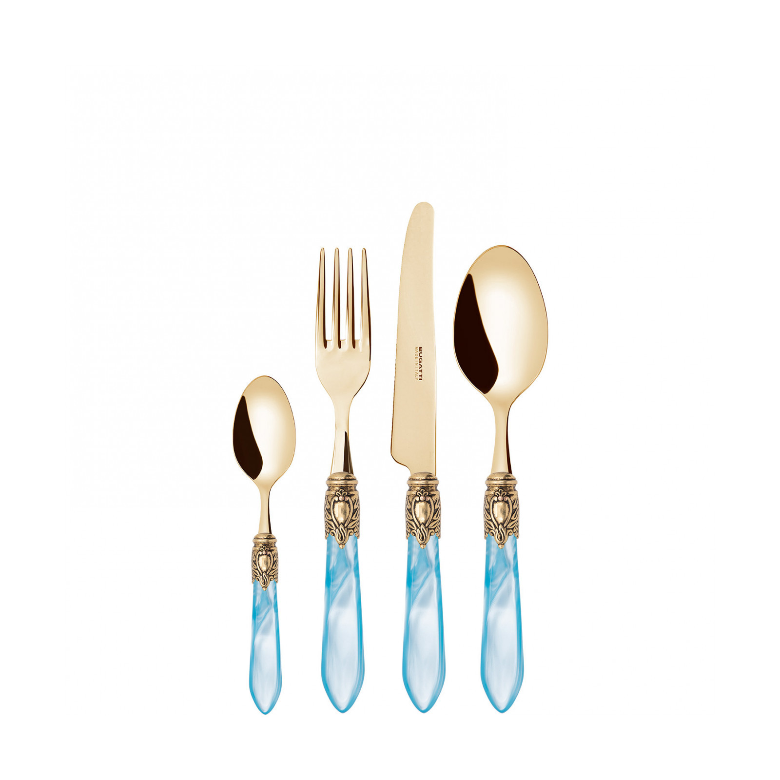 Observe the most important rules of etiquette by bringing Oxford Gold coloured cutlery to the table. To ensure an elegant table with a regal spirit, each piece in the Oxford range is made of gold PVD-coated 18/10 stainless steel, with an acrylic handle embellished with a sophisticated antique gold-finished ring that resembles a noble coat of arms. The Oxford Gold cutlery range is the perfect accessory to ensure an even more elegant and regal table setting.
