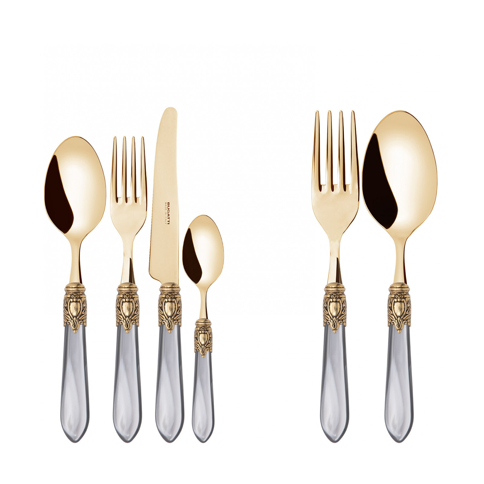 Observe the most important rules of etiquette by bringing Oxford Gold coloured cutlery to the table. To ensure an elegant table with a regal spirit, each piece in the Oxford range is made of gold PVD-coated 18/10 stainless steel, with an acrylic handle embellished with a sophisticated antique gold-finished ring that resembles a noble coat of arms. The Oxford Gold cutlery range is the perfect accessory to ensure an even more elegant and regal table setting.