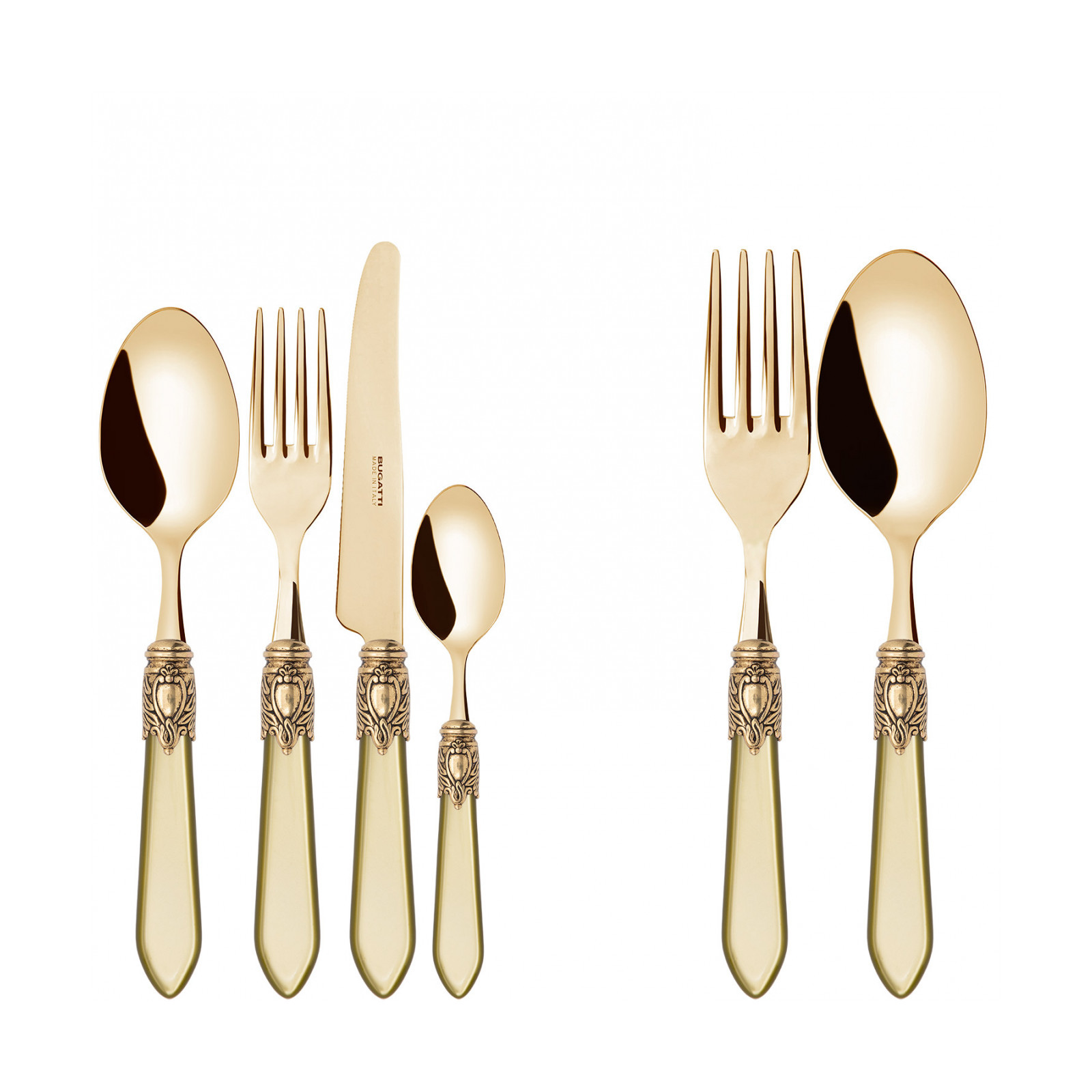 Observe the most important rules of etiquette by bringing Oxford Gold coloured cutlery to the table. To ensure an elegant table with a regal spirit, each piece in the Oxford range is made of gold PVD-coated 18/10 stainless steel, with an acrylic handle embellished with a sophisticated antique gold-finished ring that resembles a noble coat of arms. The Oxford Gold cutlery range is the perfect accessory to ensure an even more elegant and regal table setting.