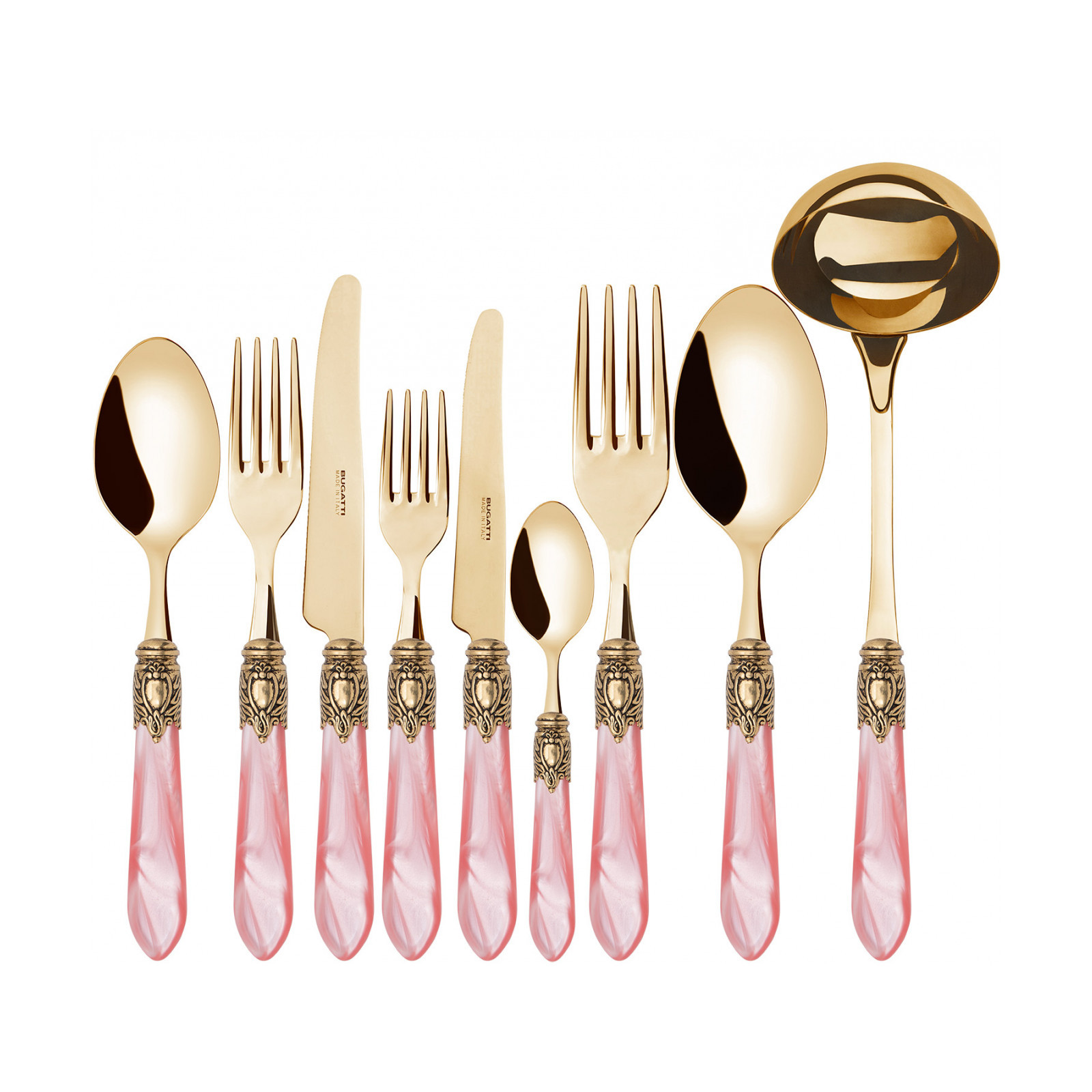 Observe the most important rules of etiquette by bringing Oxford Gold coloured cutlery to the table. To ensure an elegant table with a regal spirit, each piece in the Oxford range is made of gold PVD-coated 18/10 stainless steel, with an acrylic handle embellished with a sophisticated antique gold-finished ring that resembles a noble coat of arms. The Oxford Gold cutlery range is the perfect accessory to ensure an even more elegant and regal table setting.