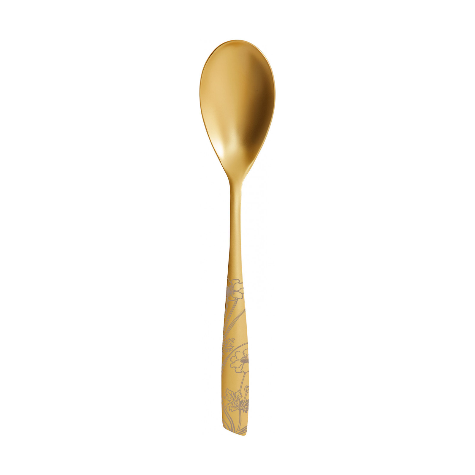The Riviera Lady Black Gold line of 18/10 stainless steel gold PVD-coated cutlery is enveloped in a refined floral motif, bringing to your table the essence of the garden of wonders from which it takes its inspiration, fashionably enhancing its elegance. This decorated cutlery motif was hand-drawn by the designer Alessandro Parascandolo and engraved on the cutlery pieces. The knife is forged in one piece. This cutlery is dishwasher safe.